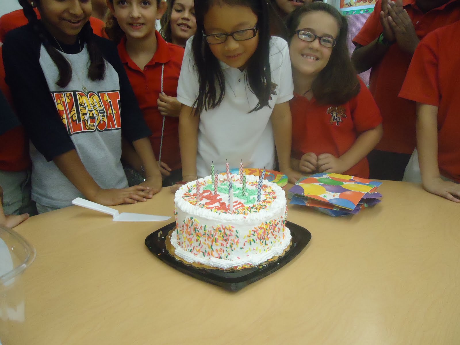 I was invited into her classroom today to share a cake with the class but keep that bit quiet cos it is against the schools rules. I told the office I was helping the teacher and with my ice cream cake, plates, spoons, camera and napkins hidden in a massive bag I signed in, received my volunteer pin and trotted off to her class.
